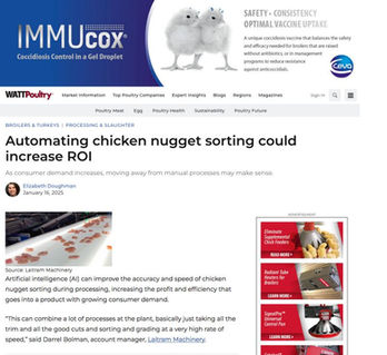 Laitram Machinery’s SMART Sorter is a high-precision vision-based and AI automatic nugget and chicken breast strip sorter that recovers from 25% to 35% more nuggets from trim than manual labor, significantly reducing labor and improving plant efficiency.